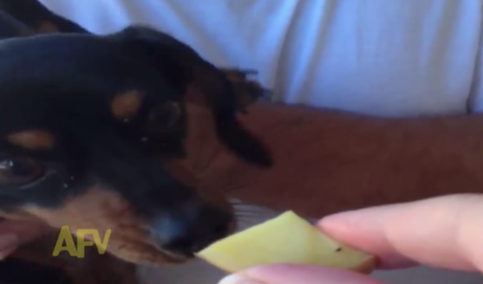 ジャガイモを食べたくてジタバタしていたワンちゃん。ジャガイモをあげらた思いがけない反応が返ってきます。