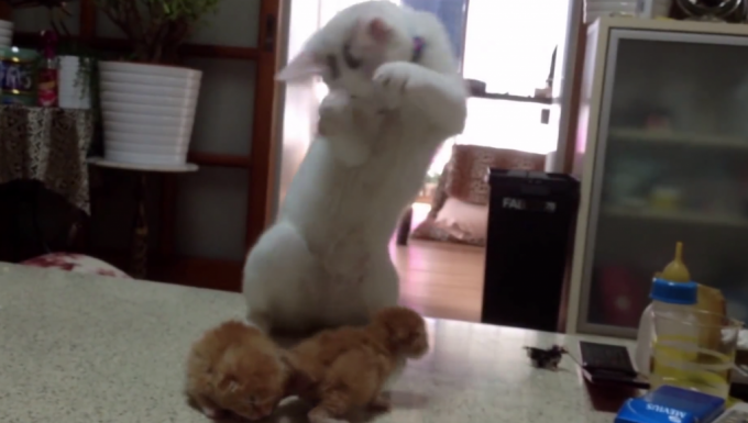 テーブルに上がり、子猫を前足でちょんちょん。すると