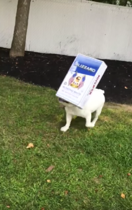 動画(YouTubeなど)ダンボール箱を咥えたブルドック。その箱がとても気に入ってしまったようで、咥えたまま離そうとしません。視界が塞がれた状態で咥えていて、前が見えないないにもかかわらず、あっちこっち歩き回ろうとします。壁にぶつかったり、駐車している車にぶつかったりと、、まるでコント状態。それでも絶対箱は離そうとしません。ちょっとおとぼけで可愛い健気なブルドックです。