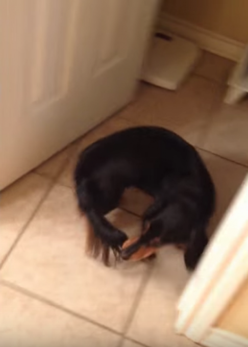 ドアから登場したのは、なんと自分の尻尾を咥えながらクルクル回っているワンちゃん。輪っかの状態で、家の中をクルクルと回りながら移動しています。あまりフラつきもせず、物にもぶつからない。結構なステップで移動しています。その姿は、まるで社交ダンスのようです。