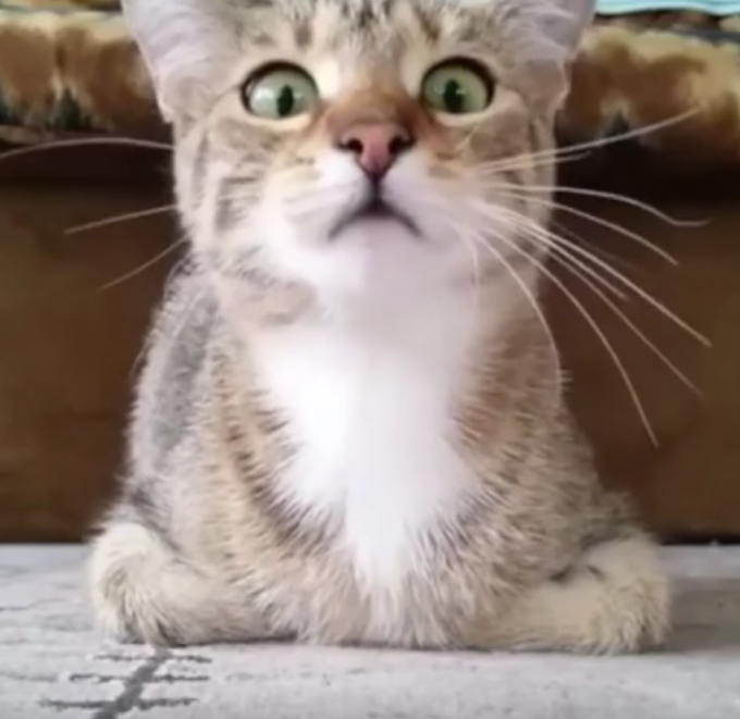 ホラー映画に釘付けになっている猫。目の瞳孔をキュッとさせ顔を左右に動かせてテレビ画面を追っているようです。瞳孔がワッと開いたり、驚いたような表情をしたり、最後は女性の叫び声で飛び出してしまいました。クールなイメージの猫ですが、このようなリアクションをするんだと笑ってしまいます。
