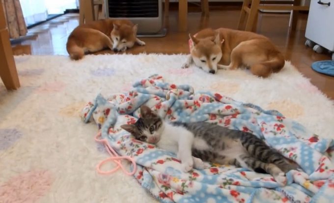 柴犬の2匹はもう寝付きそうですが、子猫のミルキーくんは寝付きが悪そう。